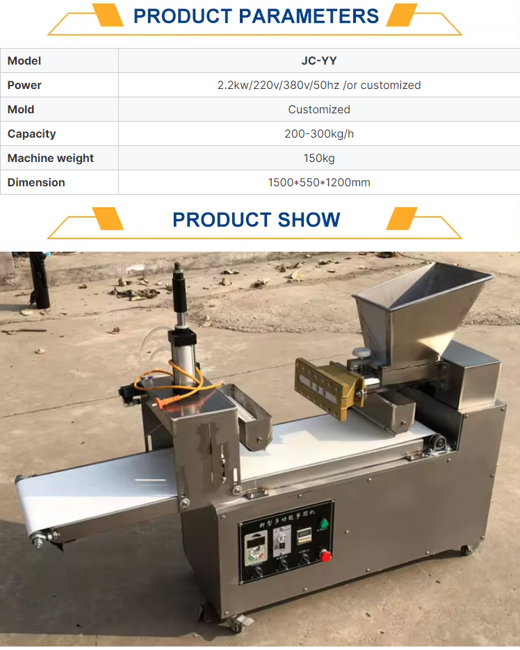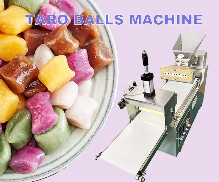The fully automatic taro ball machine is composed of a dough hopper, a cutter and a powder hopper. The cutting edge is flat and equipped with an automatic powder spreading device, which greatly increases the output and automatically screens out excess dry powder. It can produce taro balls, sweet potato balls and purple potato balls of different specifications and molds.