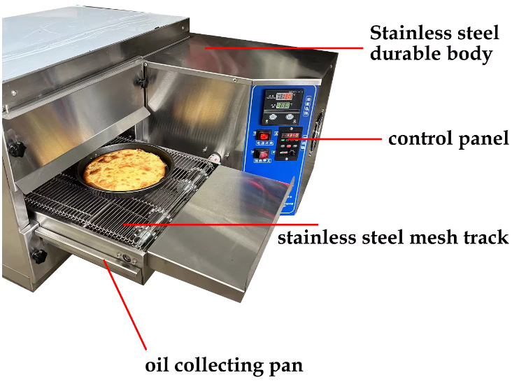 Commercial crawler-type pizza oven, made entirely of stainless steel, sturdy and durable, with adjustable oven temperature and crawler running speed, can bake pizza and other foods.